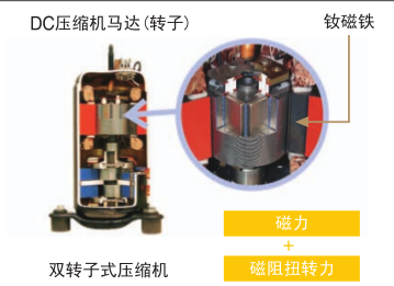 ·磁阻式直流壓縮機的轉(zhuǎn)子由磁鐵產(chǎn)生的磁力以及磁阻扭轉(zhuǎn)力提供動力,釹磁鐵的磁力可達到普通磁鐵的10倍以上,故而采用釹磁鐵直流壓縮機比傳統(tǒng)的交流和直流壓縮機具有更高的效率,使得空調(diào)在低負載時也能進行高效運轉(zhuǎn)。